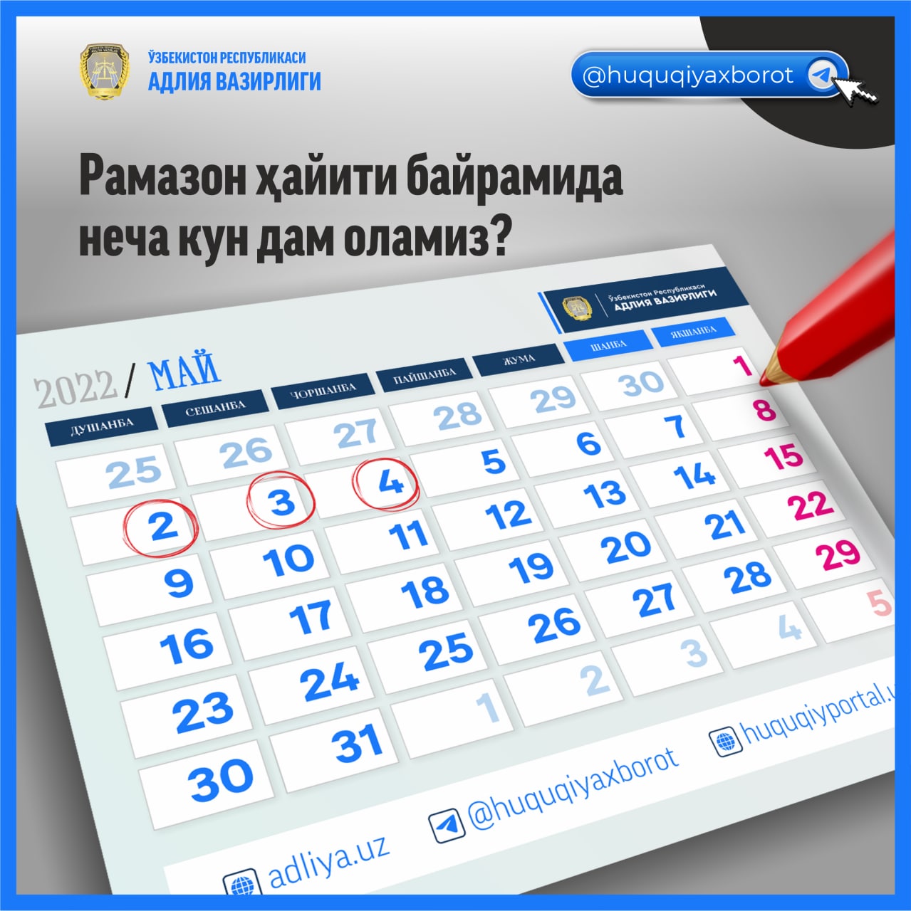 ❕Адлия вазирлиги томонидан 2022 йил 15 мартдан 15 майгача “Соғлиқни сақлаш ва таълим тизими ходимларининг ҳуқуқларини ҳимоя қилиш” ҳуқуқий акцияси ўтказилмоқда. Ҳуқуқий акцияда фаол иштирок этинг ва ҳуқуқий билимларингизни янада…