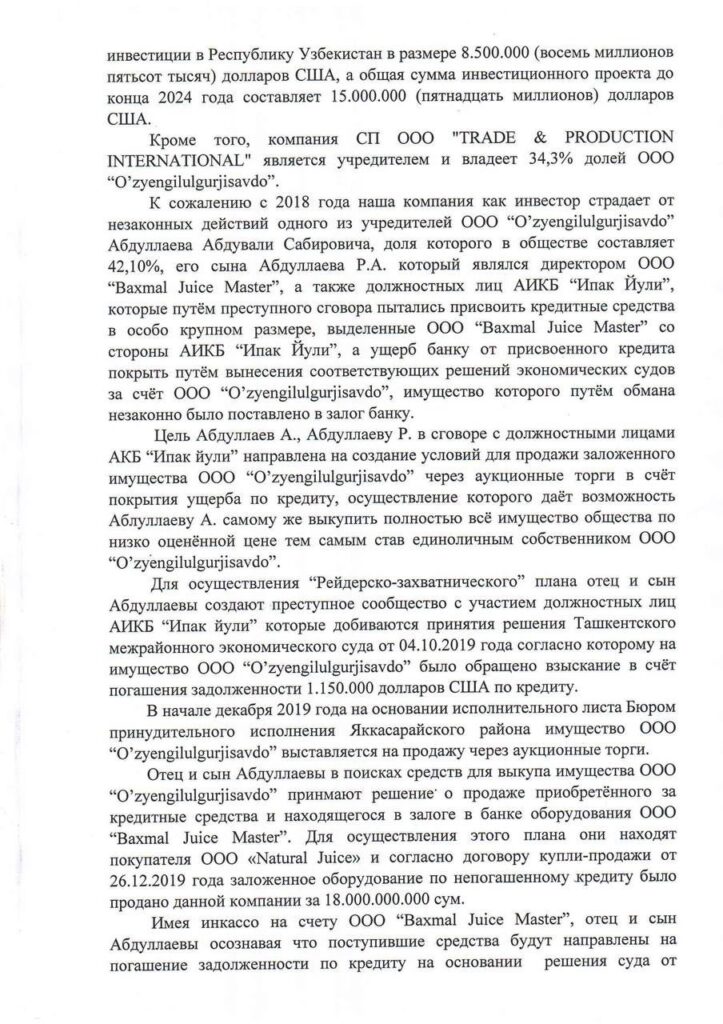 Шунингдек, ота-ўғил Абдуллаевлар суднинг 04.10.2019 йилдаги ҳал қилув қарорига асосан гаровда бўлган заводнинг сотилиб кетиши ва унинг пуллари кредит қарздорлигига йўналтирилиши мумкинлигини билиб, мазкур завод ва унинг ҳудудларини «Natural Juice» МЧЖга сотишдан иборат бўлган чорани кўрганлар. Заводни сотиш шартномасининг қиймати 14.000.000.000 сўмни ташкил этиб, шундан «Baxmal Juice Master» МЧЖнинг ҳисоб рақамига 10.000.000.000 сўм келиб тушган ҳамда ушбу пул маблағлари ҳам суд қарори асосида кредит қарздорлигига йўналтирилмасдан, “Ипак йўли банк” АИТБ мансабдор шахсларининг кўмаги билан бегоналаштирилган.