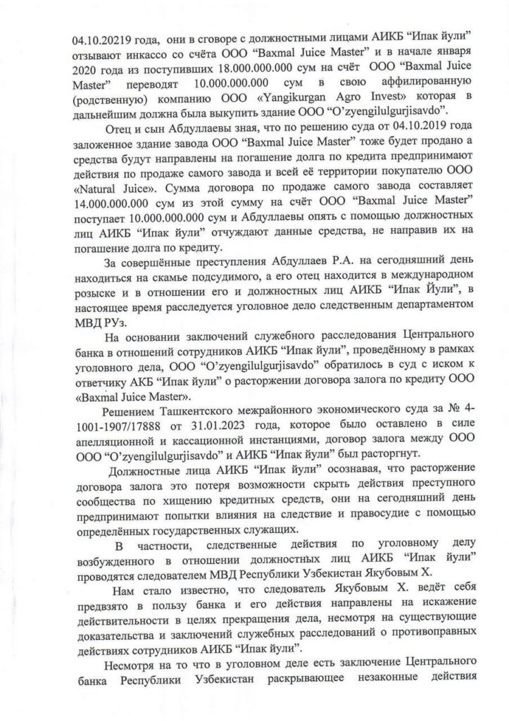 Жиноят иши материаллари орасида “Ипак йўли банк” АИТБ ходимларининг ноқонуний ҳаракатларини фош этадиган Марказий банк томонидан ўтказилган хизмат текшируви хулосаси бўлгани ҳолда, Х.Якубов ҳеч бир асоссиз банк ходимлари хатти-ҳаракати юзасидан қайта текширув тайинлаб, текширувни “Ипак йўли банк” АИТБ томонидан ўтказилишига йўл қўйиб, олинган ижобий хулосадан сўнг эса жиноят ишини тугатган. Жиноят иши тугатилганлигини эса биздан яшириб келган. Бироқ, унинг мазкур қонунга зид қарори Ўзбекистон Республикаси Бош прокуратураси томонидан бекор қилиниб, ҳозирги кунда дастлабки тергов ҳаракатлари давом эттирилмоқда.