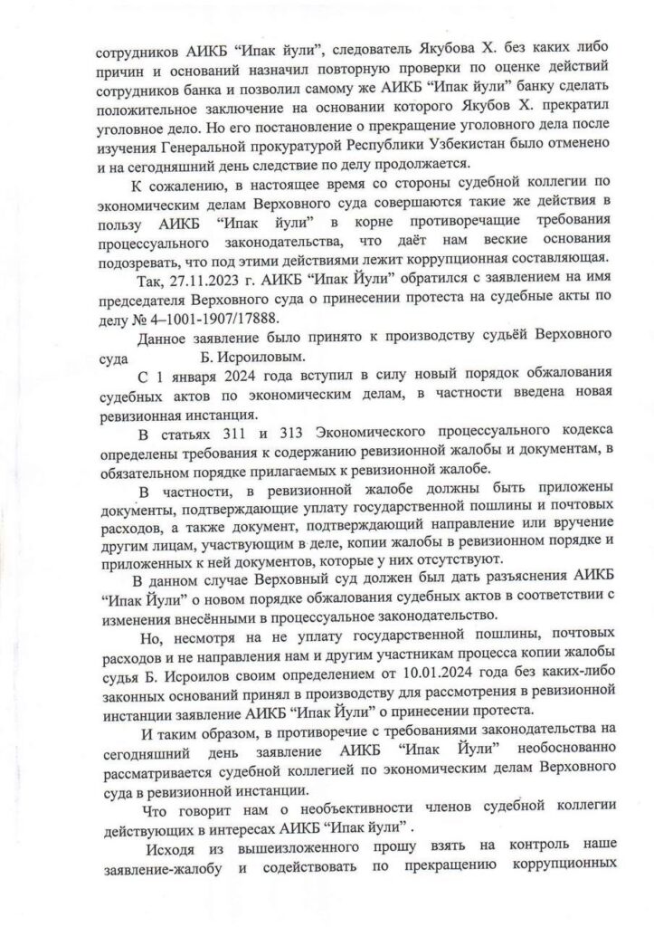 Жумладан, 27.11.2023 йилда “Ипак йўли банк” АИТБ Олий суд Раисига ариза билан мурожаат этиб, унда № 4–1001-1907/17888-сонли иш бўйича кассация инстанцияси қарорига нисбатан протест келтиришликни сўраган.