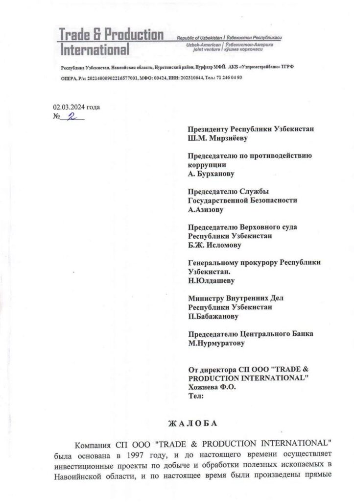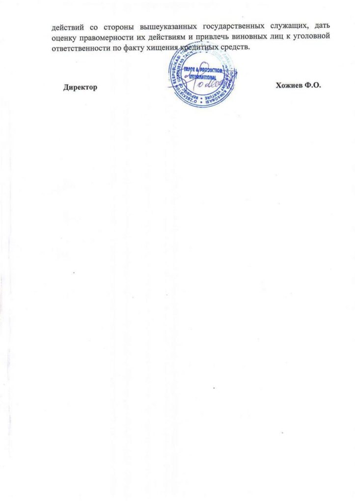 Юқорида баён этилганлардан келиб чиқиб, Сиздан бизнинг шикоятимизни назоратга олиб, қайд этилган давлат хизматчиларининг коррупцион ҳаракатларига чек қўйиш, уларнинг ҳаракатларига ҳуқуқий баҳо бериш ва кредит маблағларининг ўзлаштириб юборилганлиги ҳолати бўйича айбдор шахсларни жиноий жавобгарликка тортишда амалий ёрдам беришингизни сўрайман.