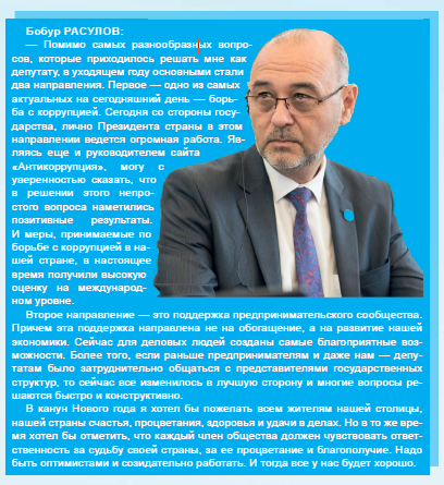 Биринчиси — коррупцияга қарши кураш. Бу курашда Юртбошимиз бошчилигида давлат томонида катта қадамлар қўйилмоқда. Тошкент шаҳар кенгаши депутати ва “Antikorr.Uz” ОАВ рахбари сифатида ишонч билан шуни таъкидлашим лозимки, хозирги кунда бу курашда аниқ натижаларга эришилмоқда. Коррупция билан курашишдек мураккаб жараёнлардаги ижобий натижаларимиз, халқаро даражада хам эътироф этироф этилмоқда.